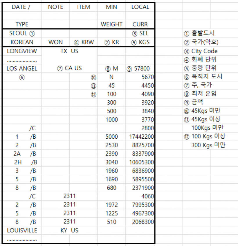 라. 모든 화물 요율을 KG(LB당)당 요율을 적용하여 운임적용 중량을 곱하여 산출한다.